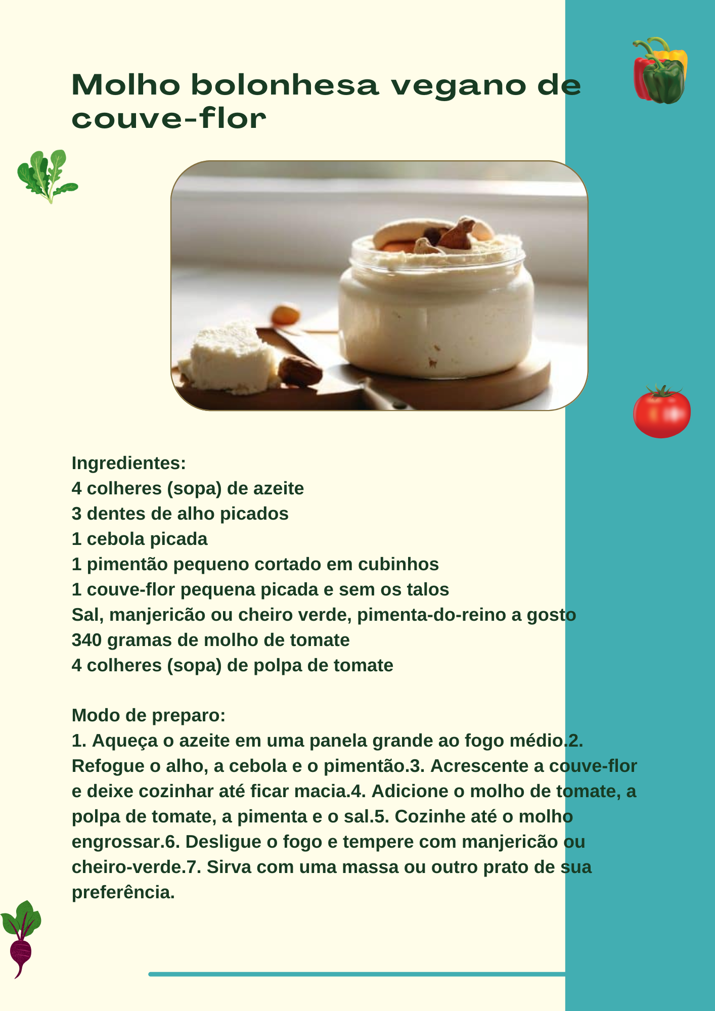 Este ebook foi criado com muito cuidado e paixão para trazer até você 77 receitas exclusivas de molhos e patês veganos, pensadas para transformar qualquer refeição em um momento especial. Seja você um amante da culinária vegana, alguém em transição para um estilo de vida mais sustentável ou apenas em busca de novas inspirações na cozinha, aqui você encontrará tudo o que precisa para enriquecer seus pratos de forma saudável e saborosa.